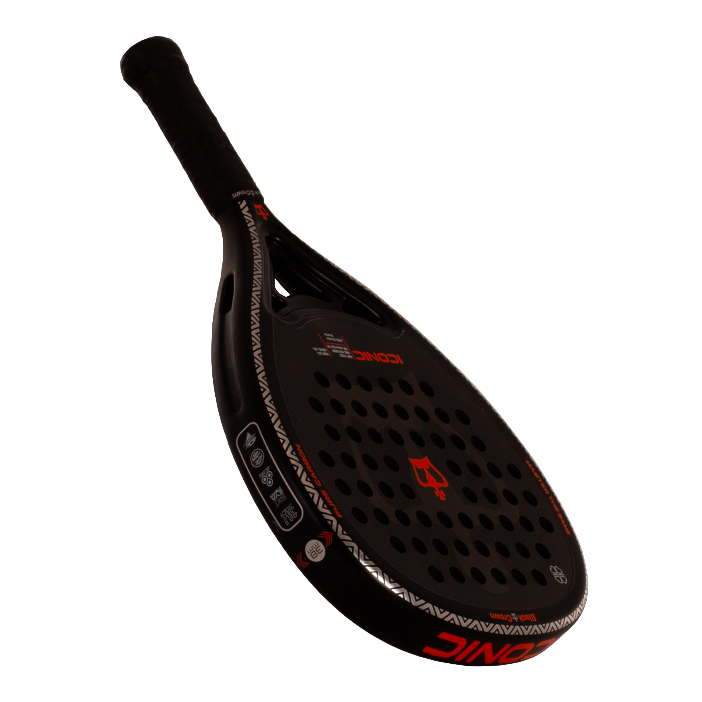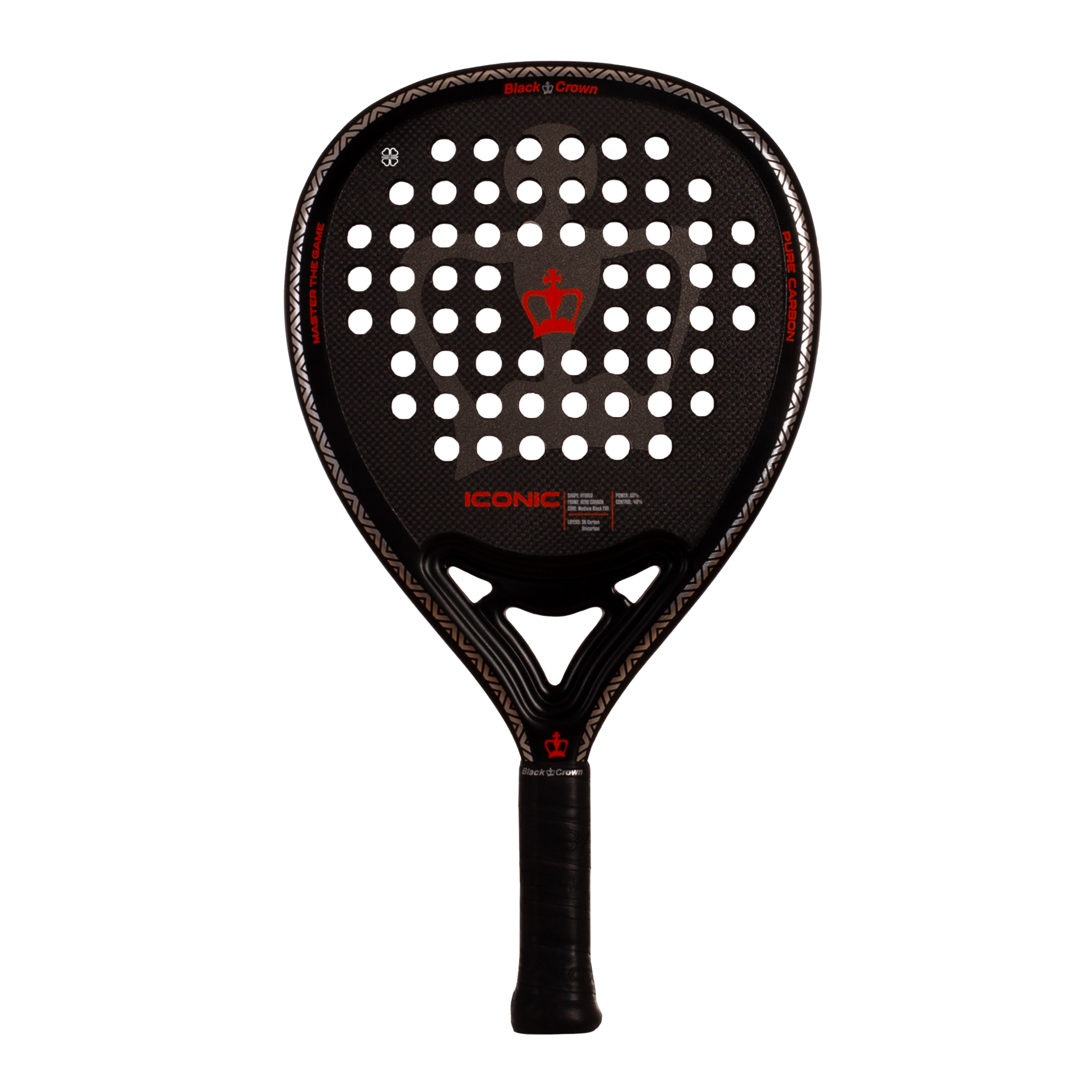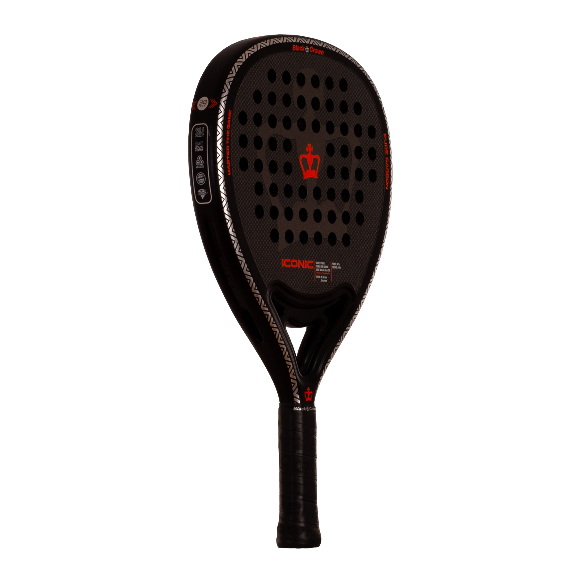 **Black Crown Iconic: αίσθηση και δύναμη με ασφάλεια.** Μια ρακέτα με μεγάλο sweet spot, Soft EVA Black και φινίρισμα Sandspin για απαιτητικούς παίκτες.