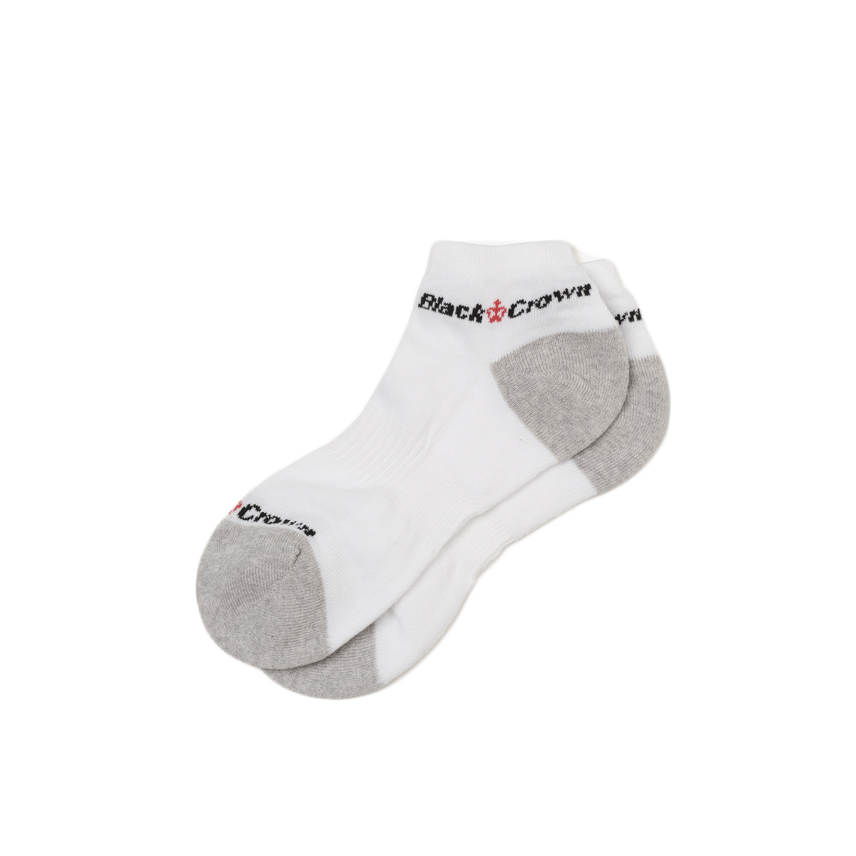 Ειδικές κοντές κάλτσες Black Crown για αθλήματα, κατασκευασμένες για να εγγυώνται μέγιστη άνεση στον παίκτη στις κινήσεις του. Συνδυασμός λευκών και γκρι χρωμάτων.